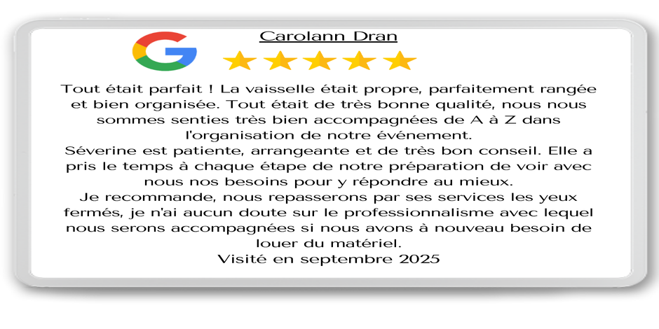 Le matériel est loué propre et doit être rendu dans le même état. Concernant la vaisselle, le lavage inclus mais pour une raison évidente d'hygiène, les assiettes doivent être vidées et rincées, avant le retour. En cas de non respect de cette mesure, la somme forfaitaire de 100 € sera exigée.